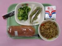 コッペパン、ししゃもの磯辺揚げ、ブロッコリーの塩ゆで、焼きそば、パテチョコ、牛乳です。